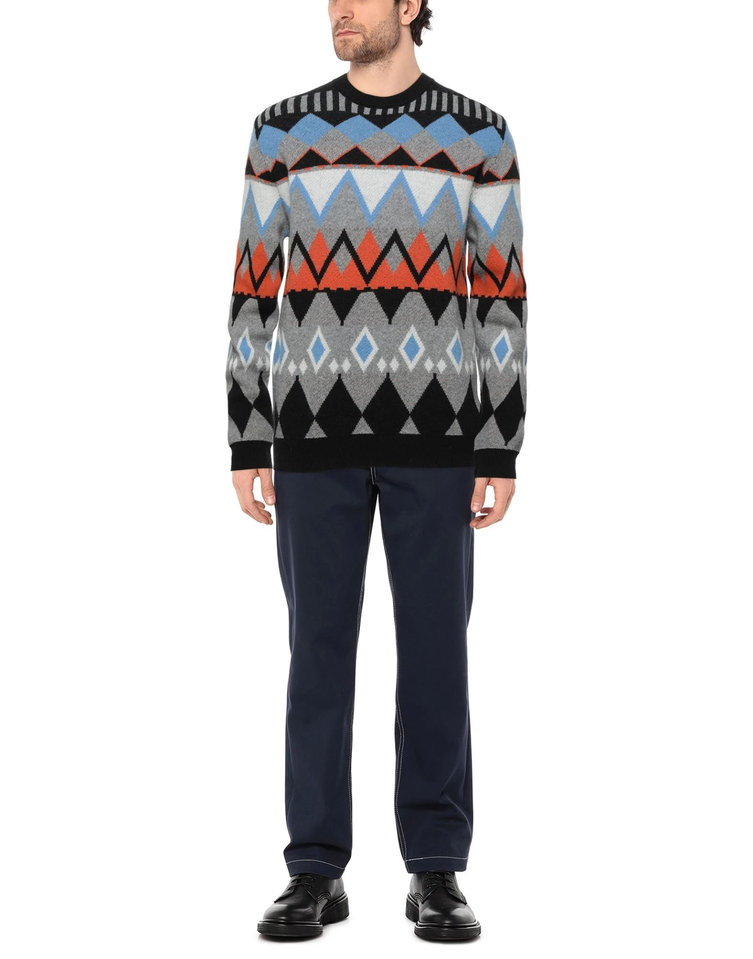 knitted, lightweight knit, geometric design, round collar, long sleeves, no pockets, no appliqués, small sized