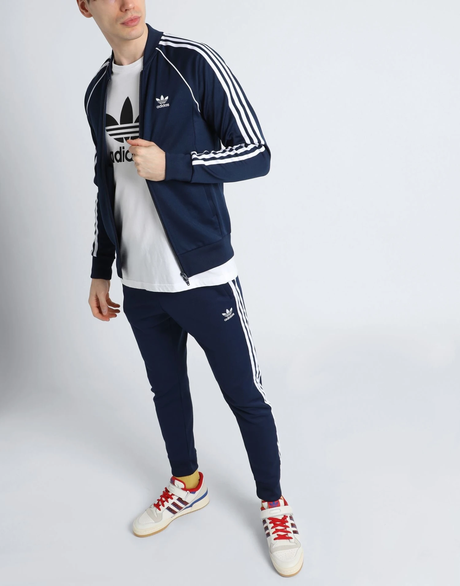 techno fabric, side seam stripes, solid color, mid rise, elasticized waist, tapered leg, comfort fit, drawstring closure, multipockets, lifestyle, adidas adicolor, sporty