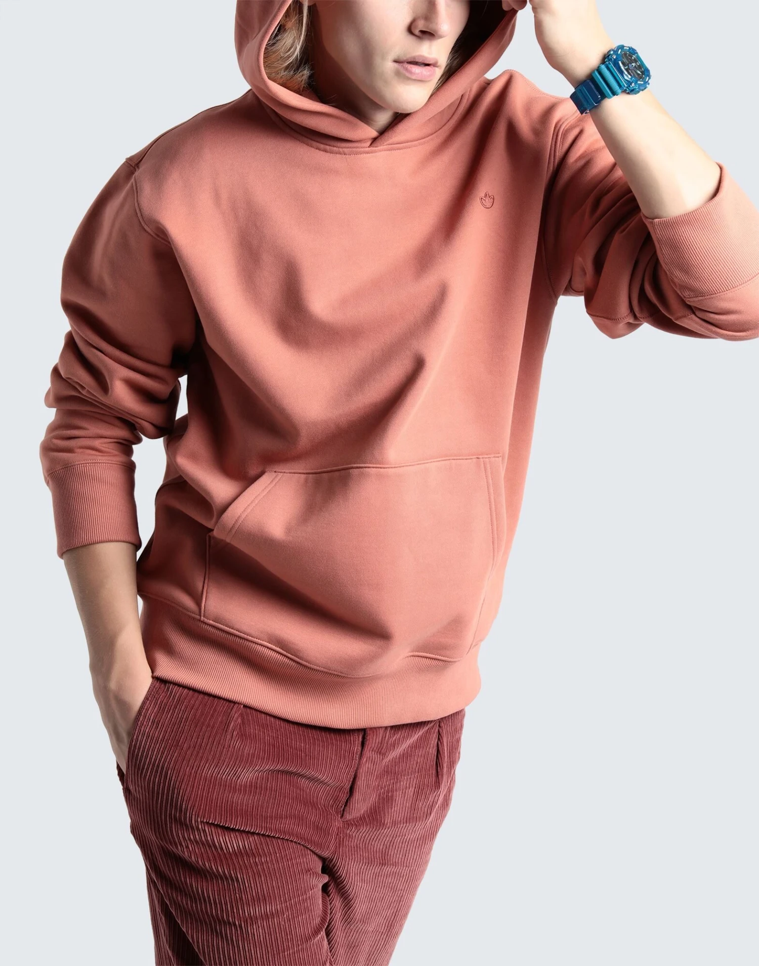 sweatshirt fleece, brand logo, solid color, hooded collar, long sleeves, fleece lining, single pocket, lifestyle, this brand is member of better cotton initiative (bci), supporting more sustainable cotton farming., large sized