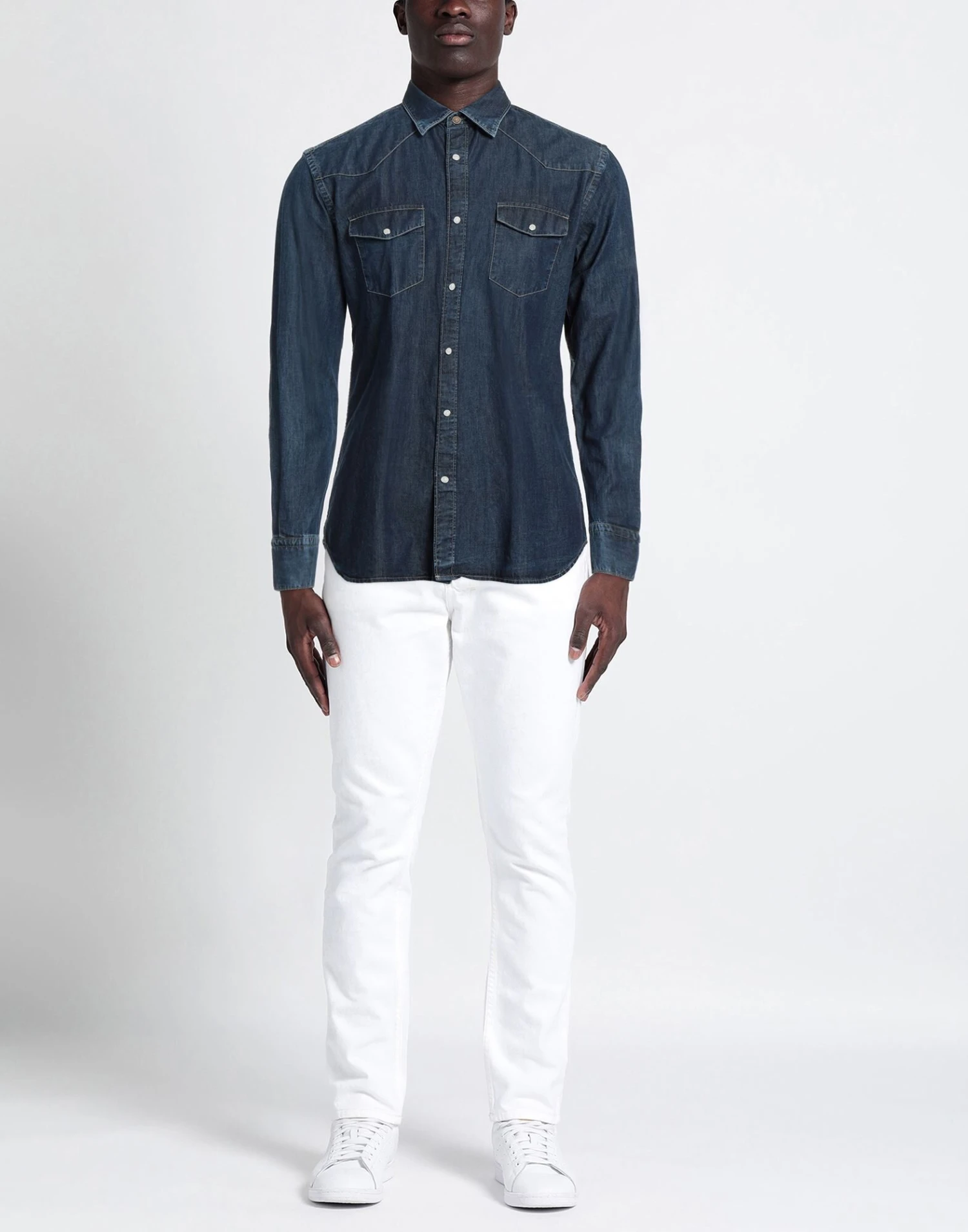 denim, no appliqués, solid color, dark wash, classic neckline, long sleeves, snap button cuffs, snap buttons fastening, two breast pockets