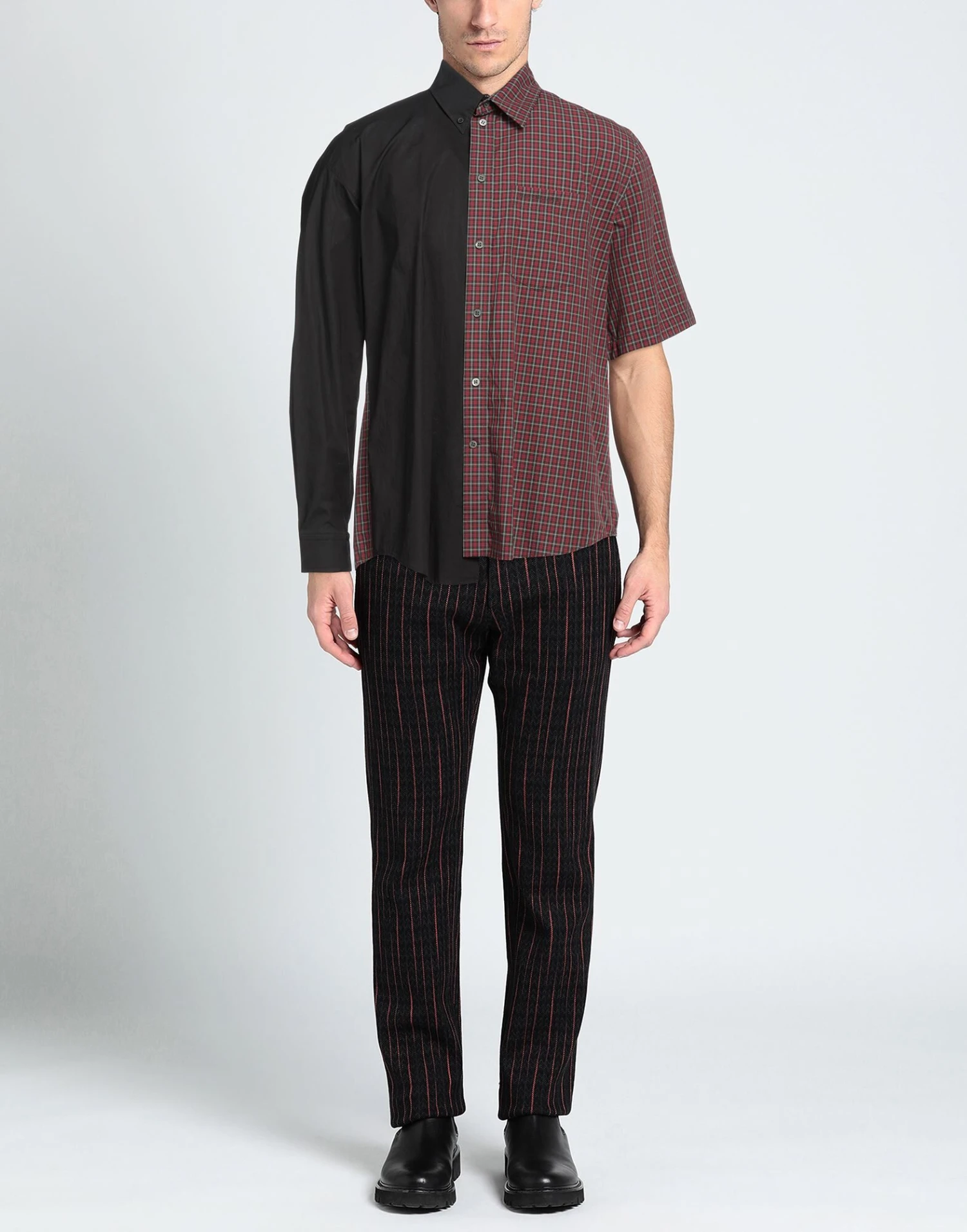 plain weave, brand logo, tartan pattern, classic neckline, short sleeves, button closing, single pocket, stretch, large sized