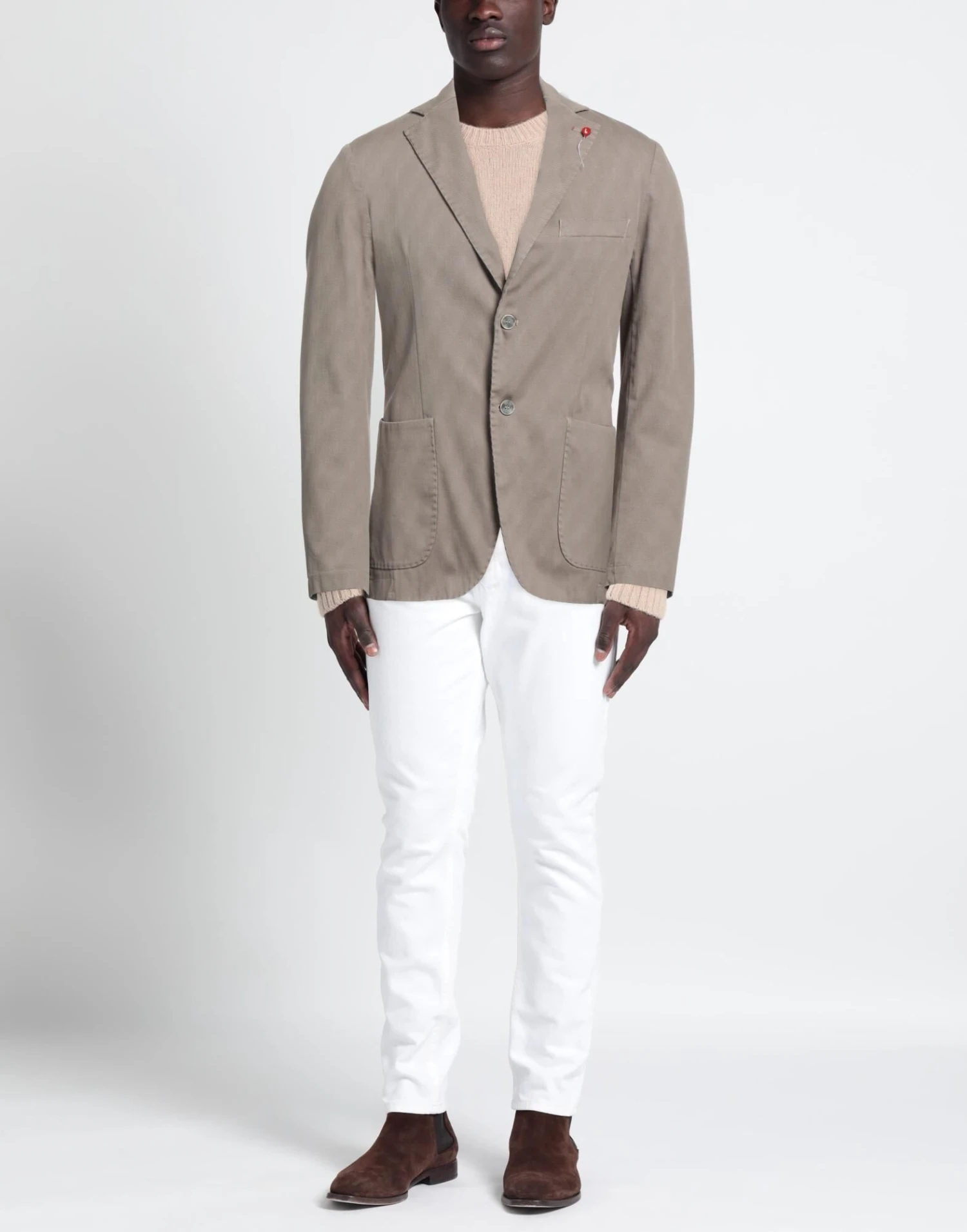 plain weave, brooch, brand logo, solid colour with appliqués, lapel collar, single-breasted , long sleeves, buttoned cuffs, partially lined interior, button closing, multipockets, dual back vents, stretch, single-breasted jacket