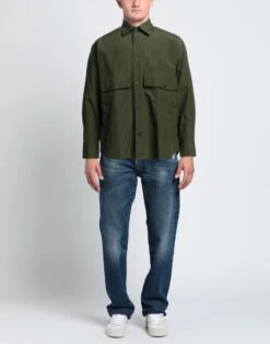 plain weave, denim effect, no appliqués, solid color, classic neckline, long sleeves, button closing, no pockets