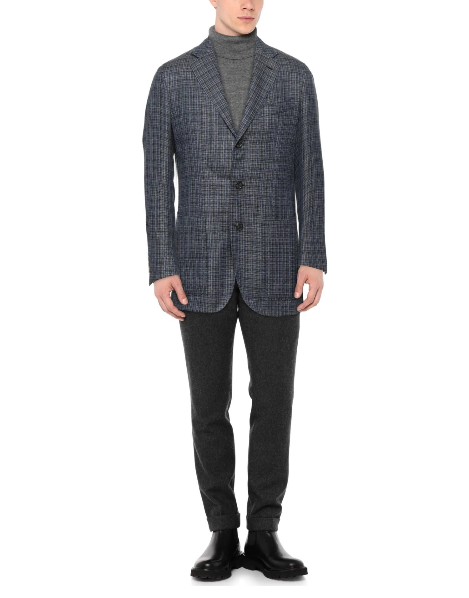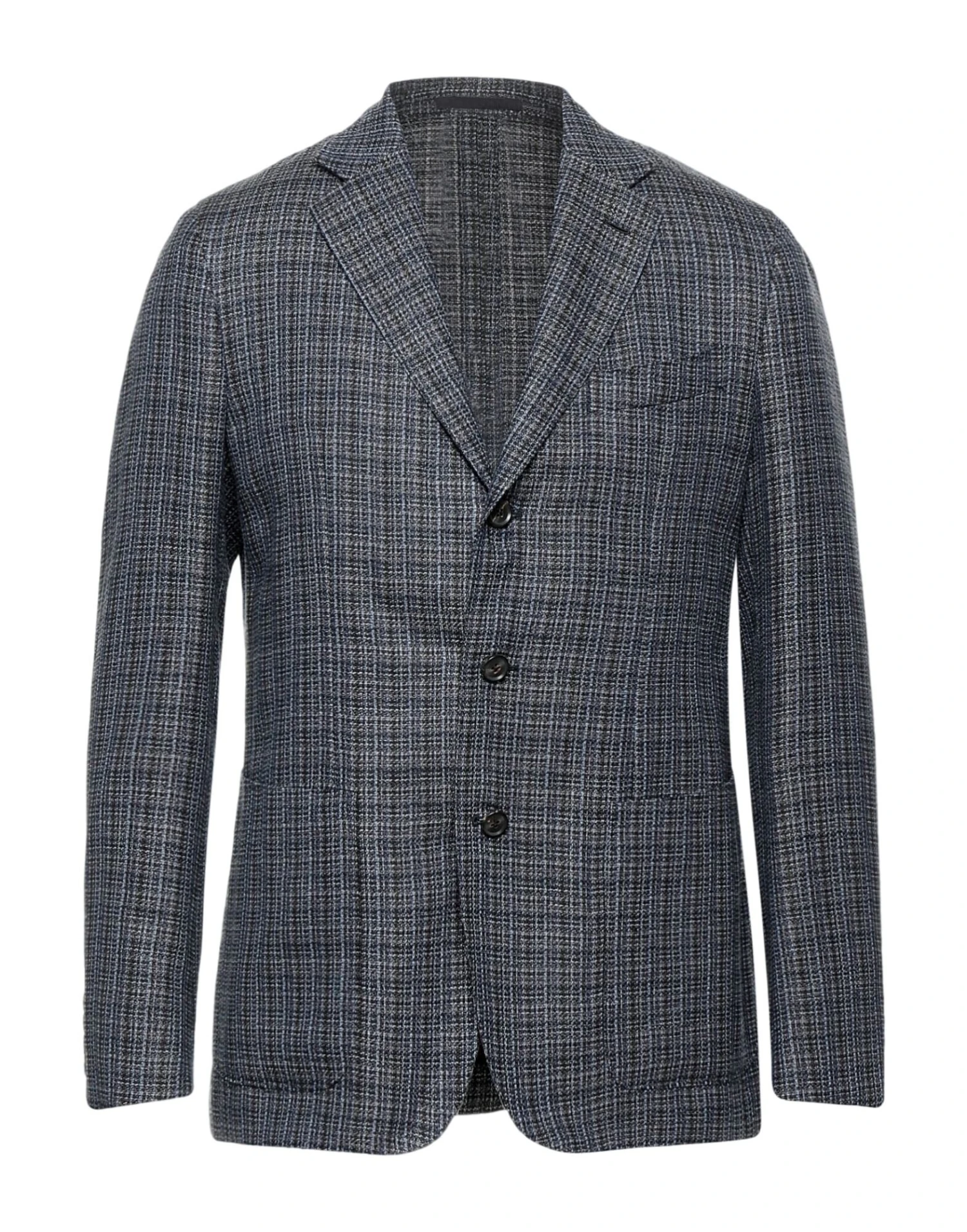 plain weave, no appliqués, multicolor pattern, single-breasted , lapel collar, long sleeves, partially lined interior, button closing, dual back vents, multipockets