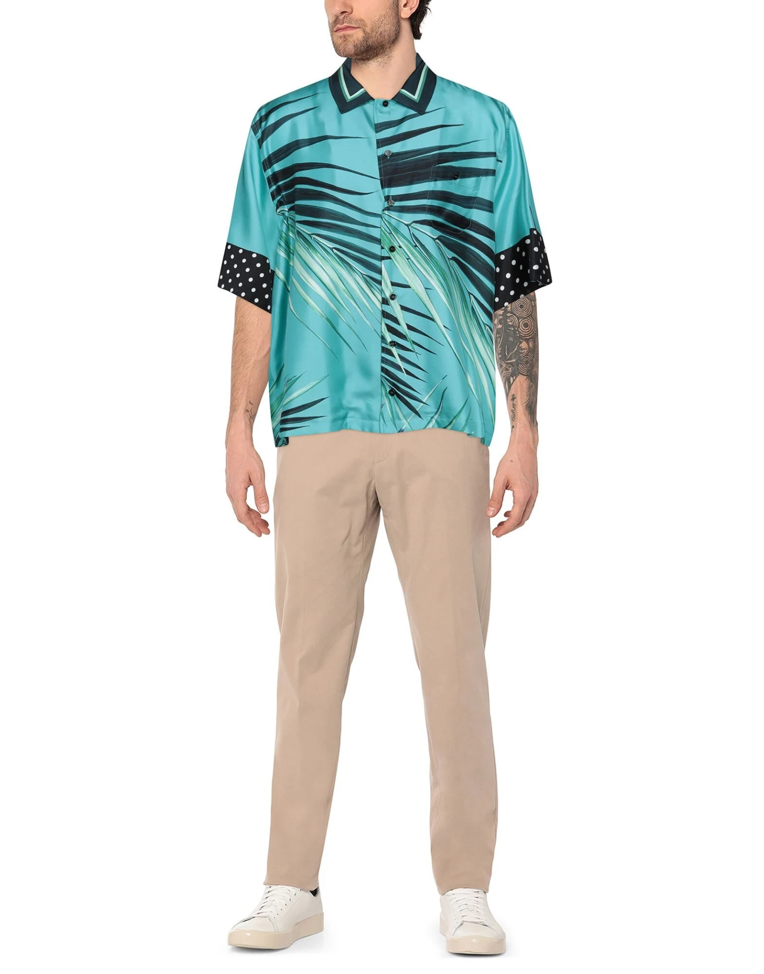 satin, no appliqués, floral design, classic neckline, short sleeves, single chest pocket, large sized
