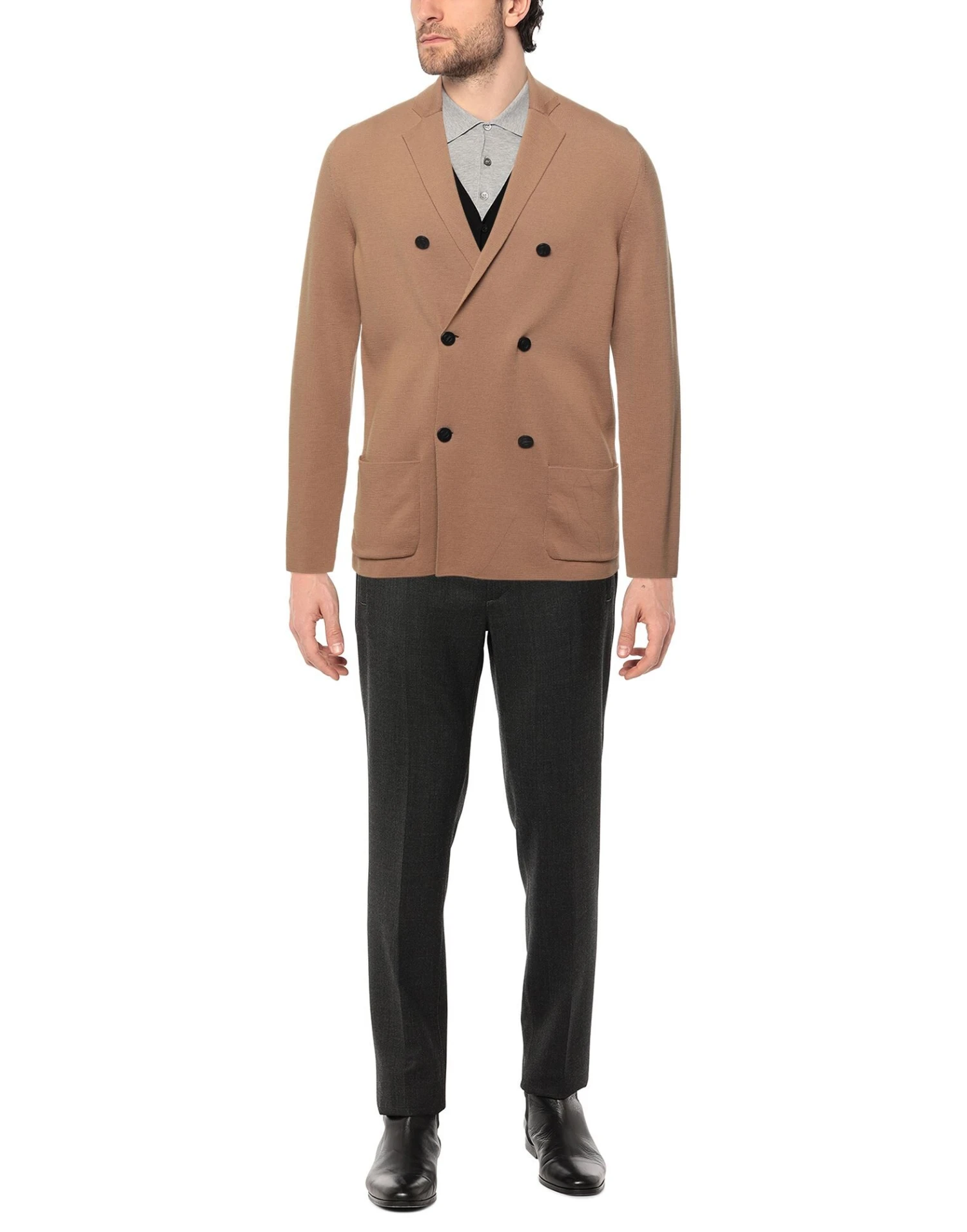 knitted, no appliqués, solid color, lapel collar, long sleeves, double-breasted, multipockets, button closing, unlined