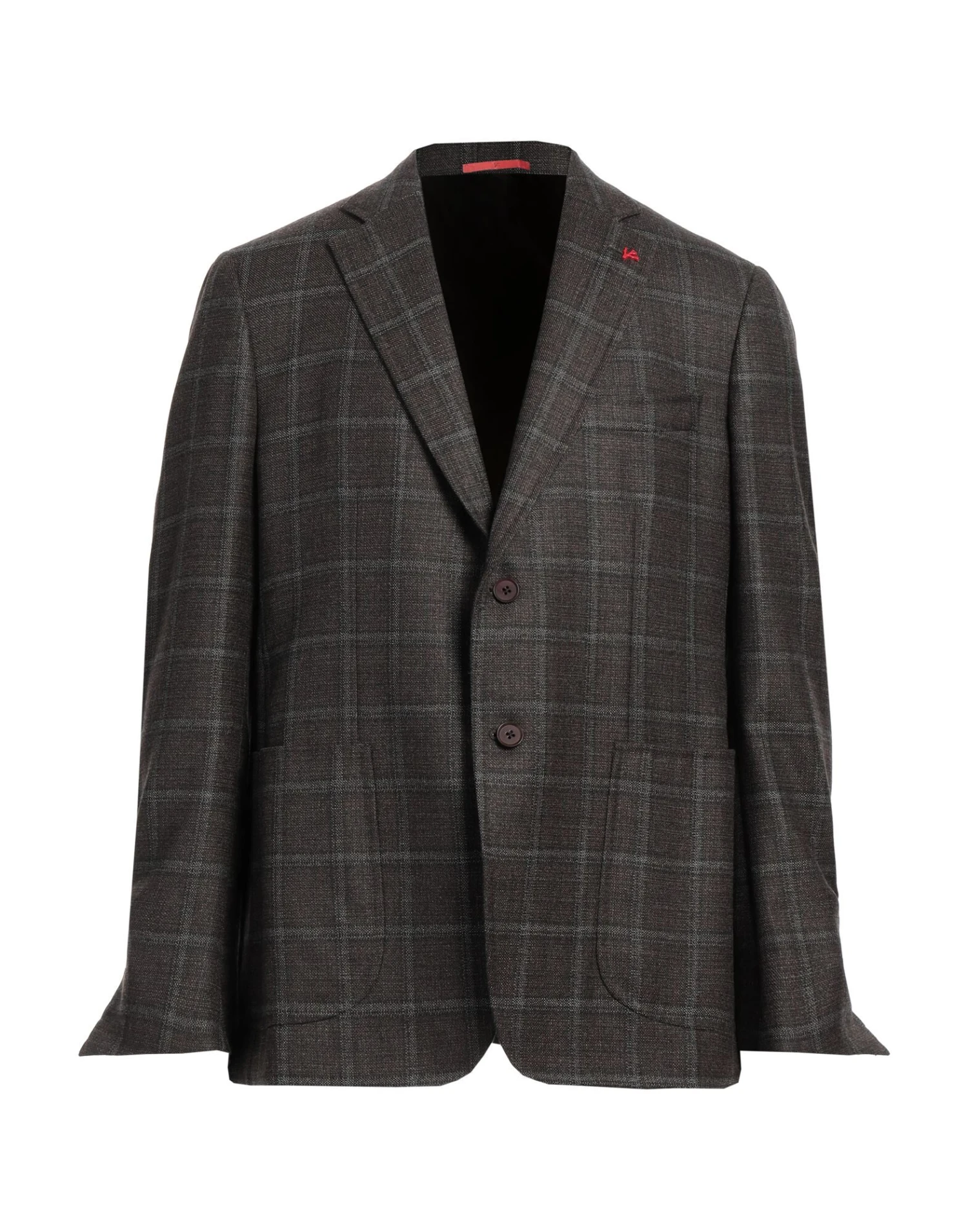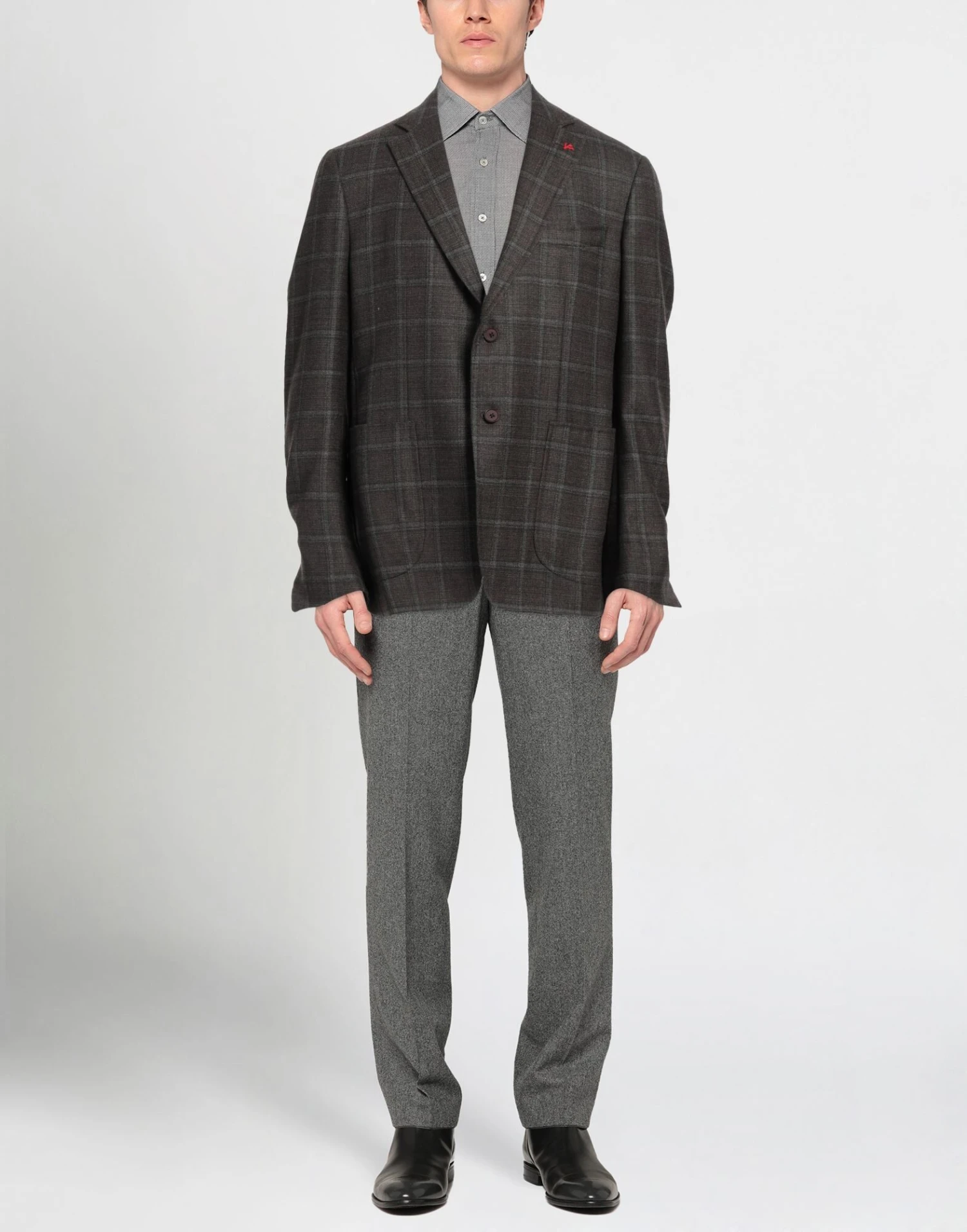 cool wool, brooch, tartan pattern, lapel collar, single-breasted , long sleeves, slit cuffs, partially lined interior, button closing, multipockets, dual back vents, single-breasted jacket