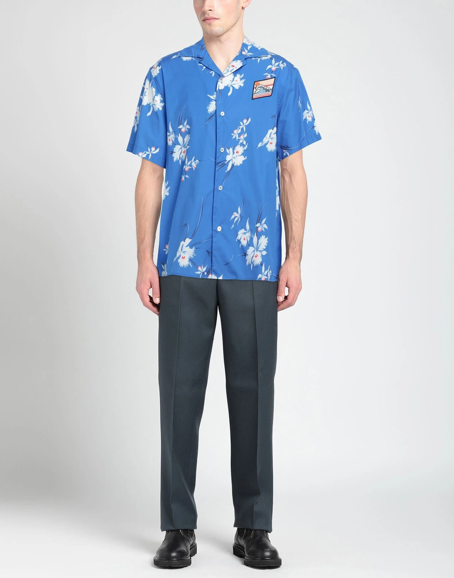 plain weave, contrasting applications, brand logo, floral design, classic neckline, short sleeves, built-in bodysuit, no pockets, contains non-textile parts of animal origin, large sized