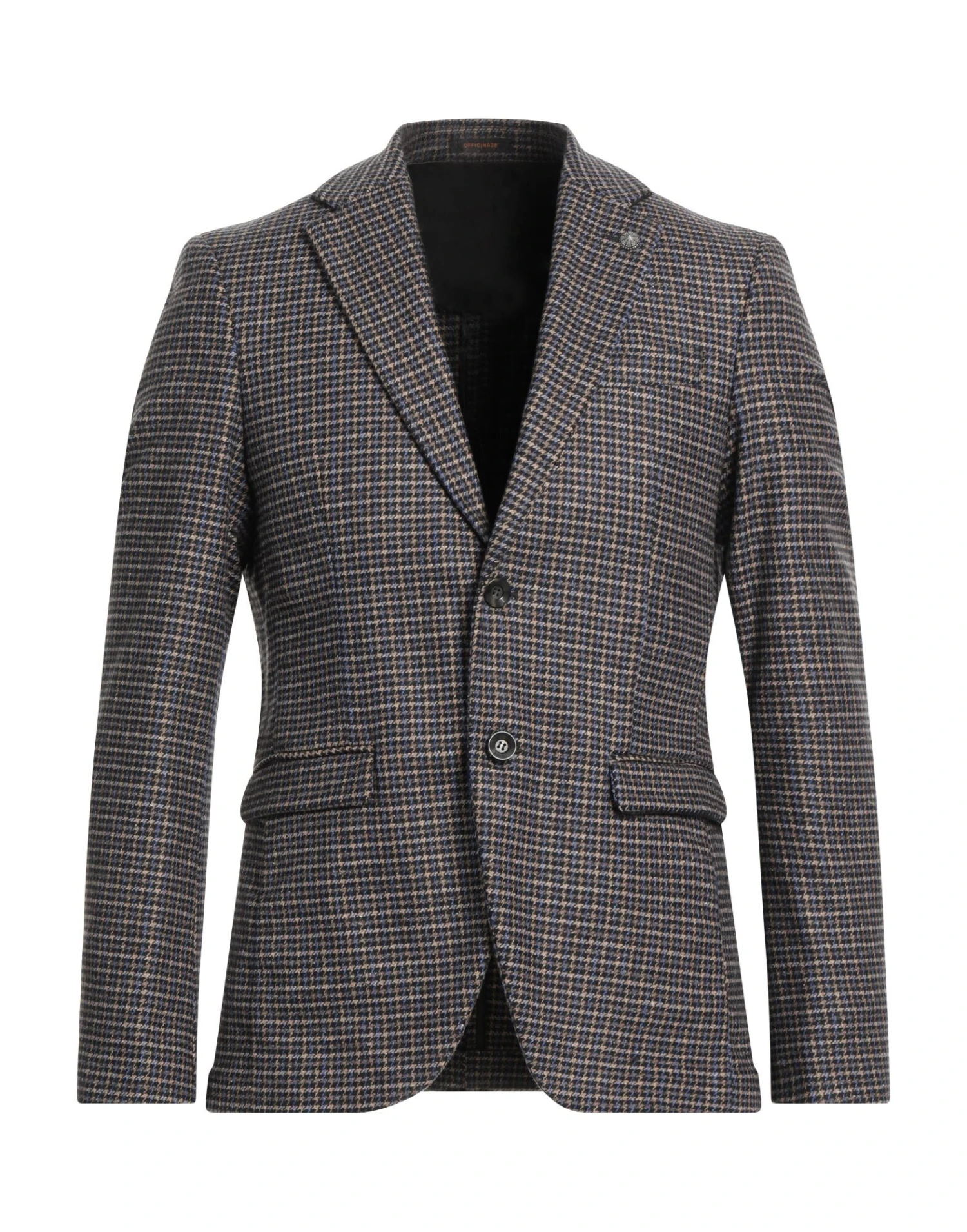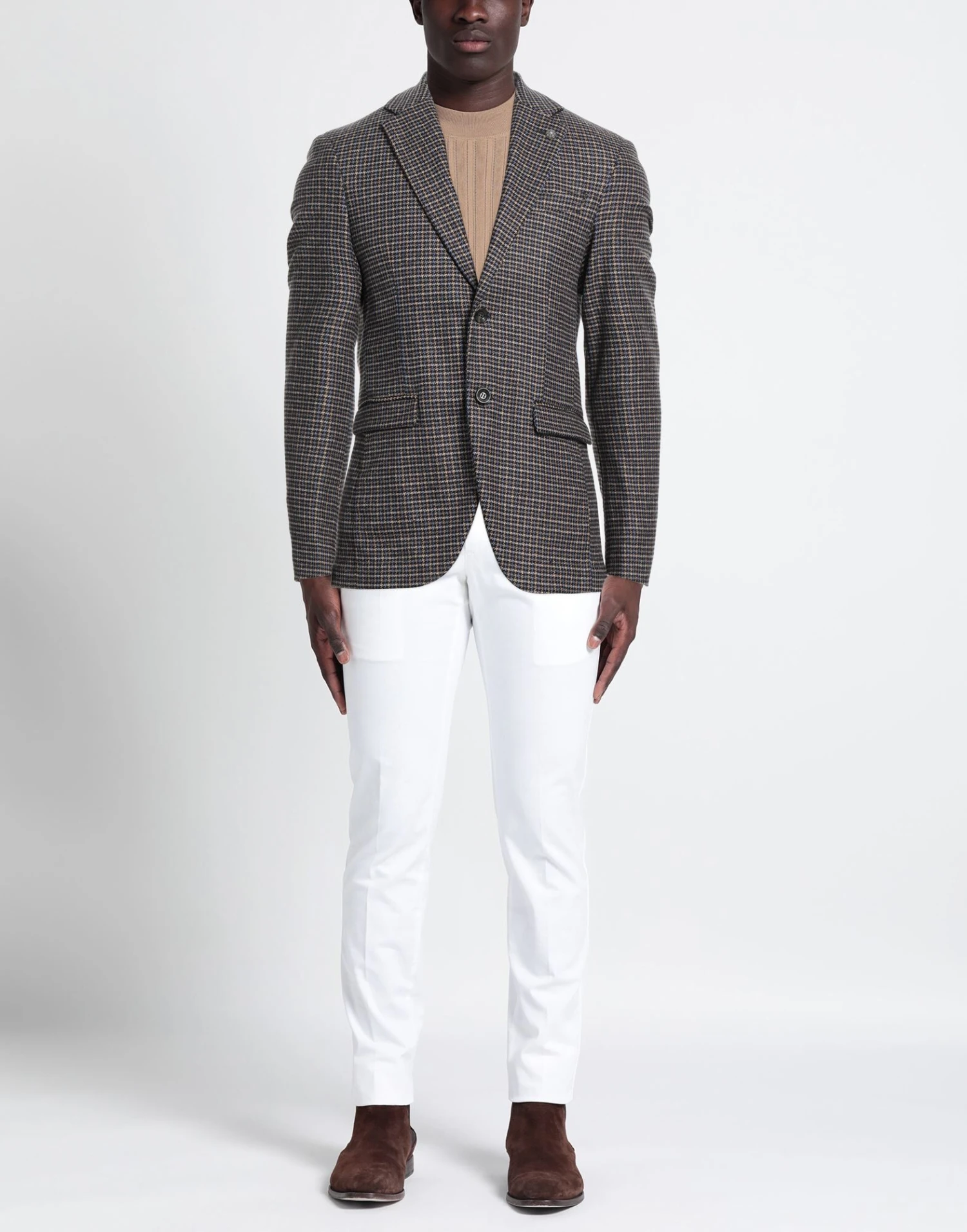 flannel, tweed, contrasting applications, no appliqués, houndstooth, lapel collar, single-breasted , long sleeves, partially lined interior, button closing, multipockets, dual back vents, stretch, single-breasted jacket