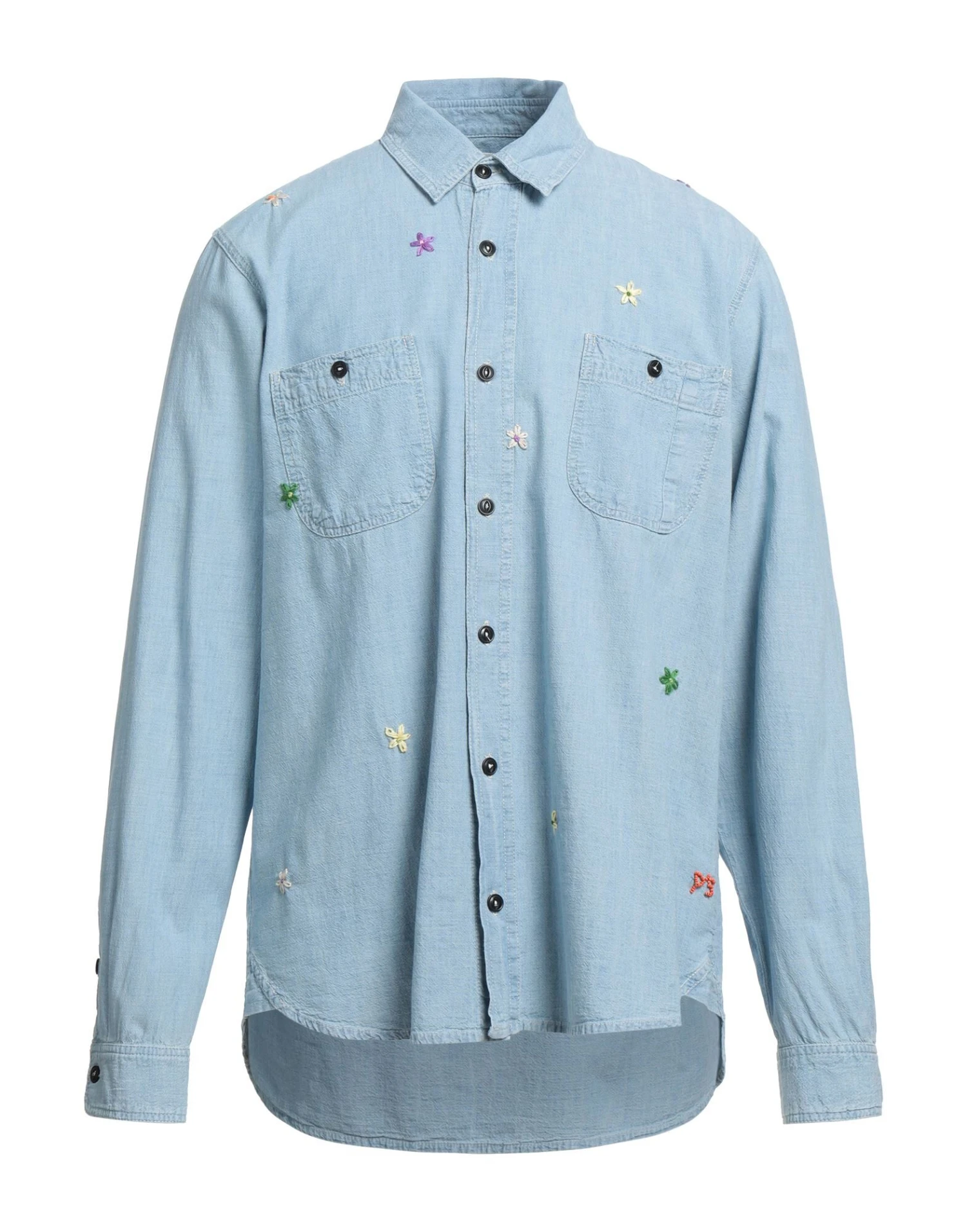 plain weave, denim effect, embroidered detailing, brand logo, solid colour with appliqués, classic neckline, long sleeves, buttoned cuffs, button closing, two breast pockets