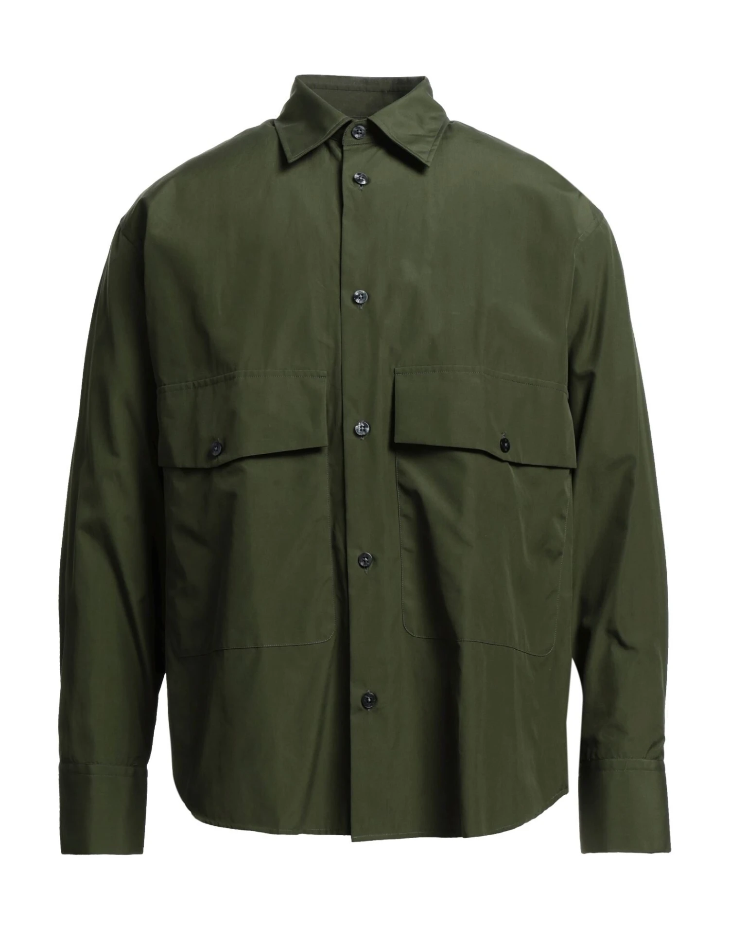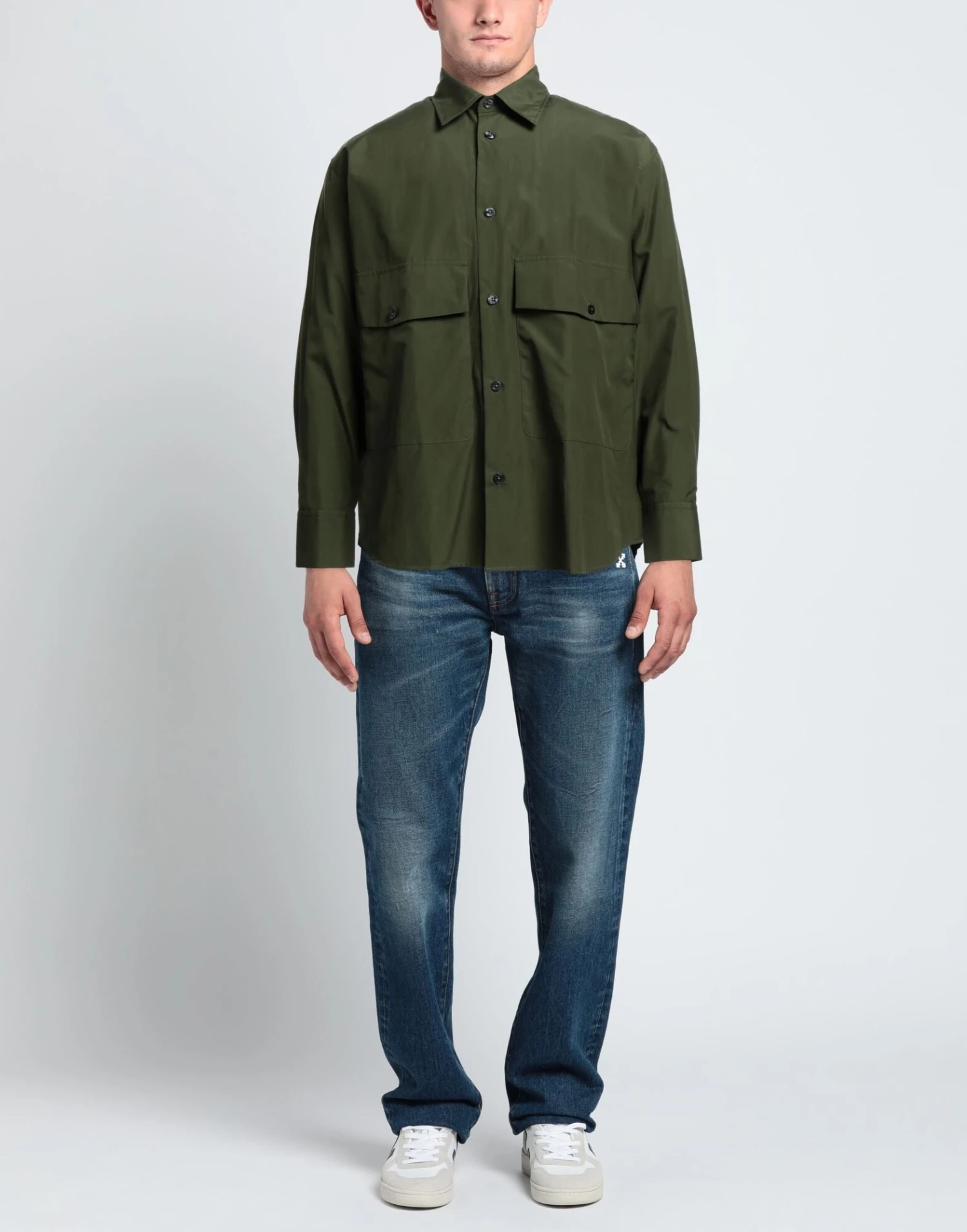 plain weave, brand logo, solid color, classic neckline, long sleeves, button closing, two breast pockets