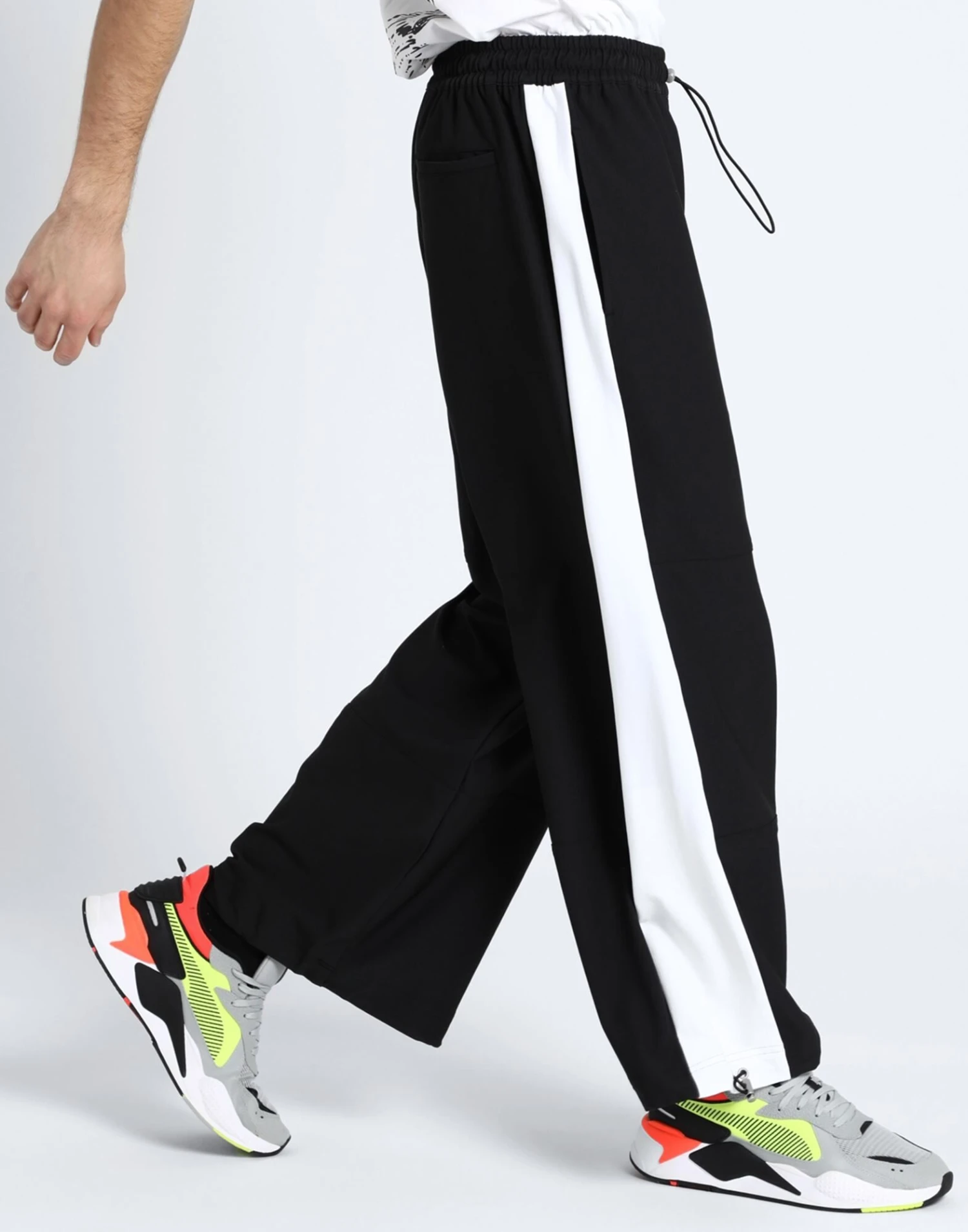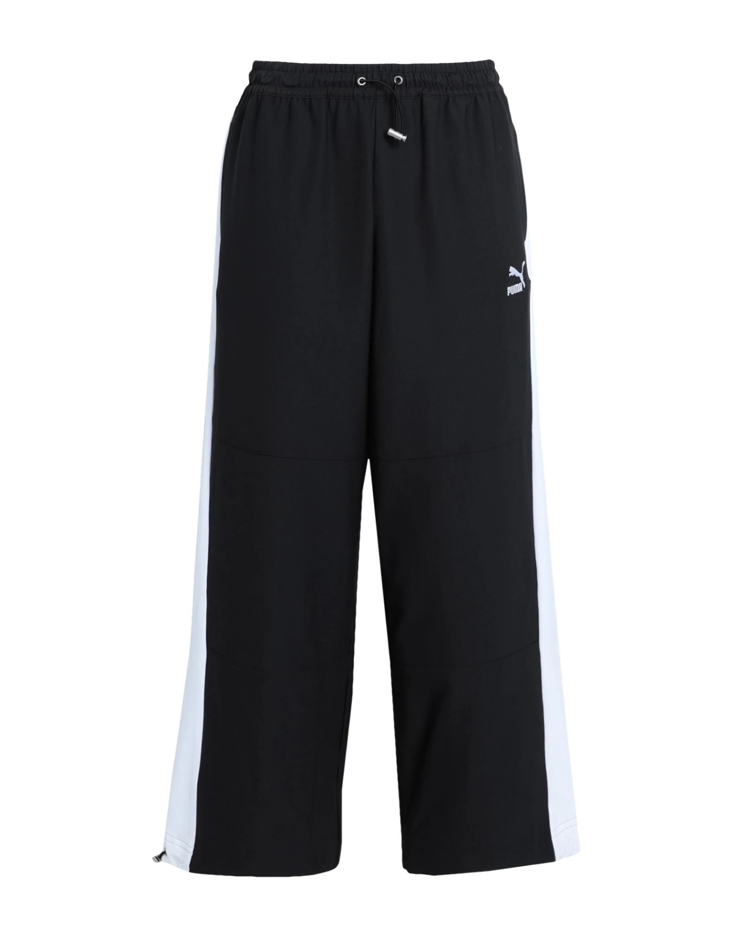 crepe, side seam stripes, brand logo, two-tone, high waisted, elasticized waist, wide leg, comfort fit, drawstring closure, drawstring hem, multipockets, stretch, lifestyle, pants