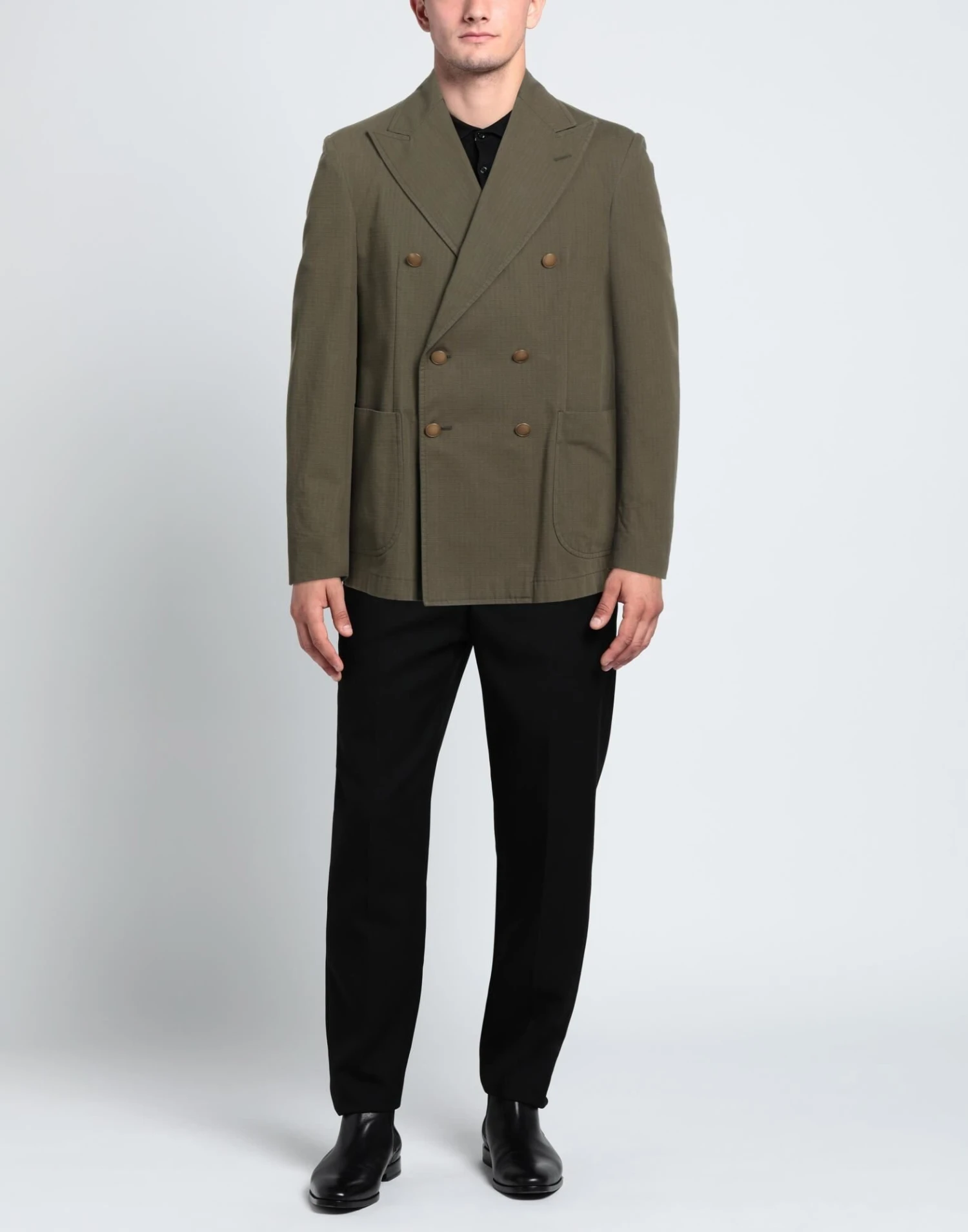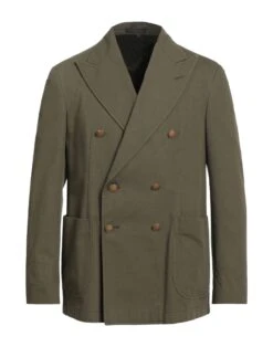 plain weave, no appliqués, solid color with print, lapel collar, double-breasted, long sleeves, partially lined interior, button closing, multipockets, double-breasted jacket