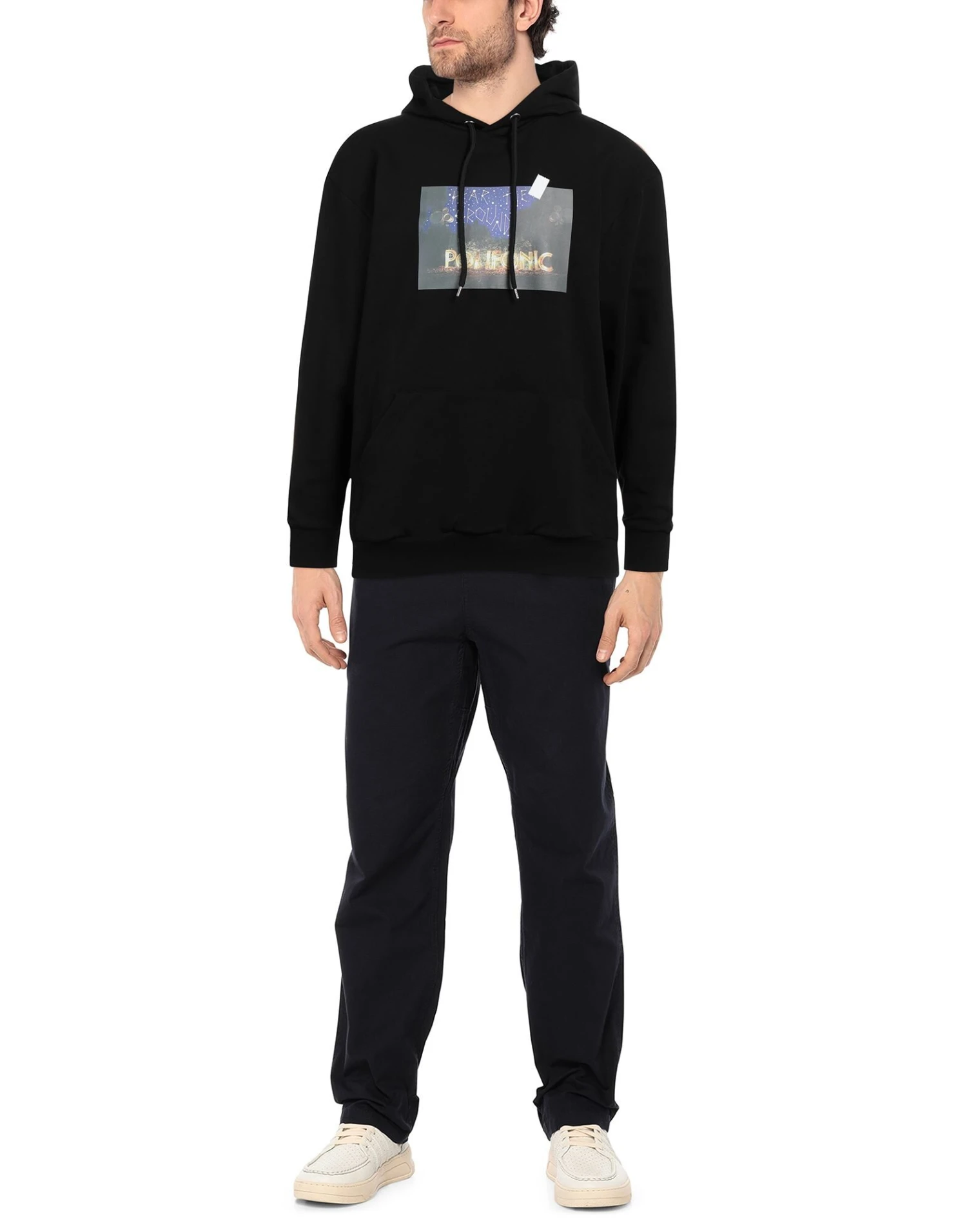 sweatshirt fleece, brand logo, solid color with print, hooded collar, long sleeves, single pocket, french terry lining