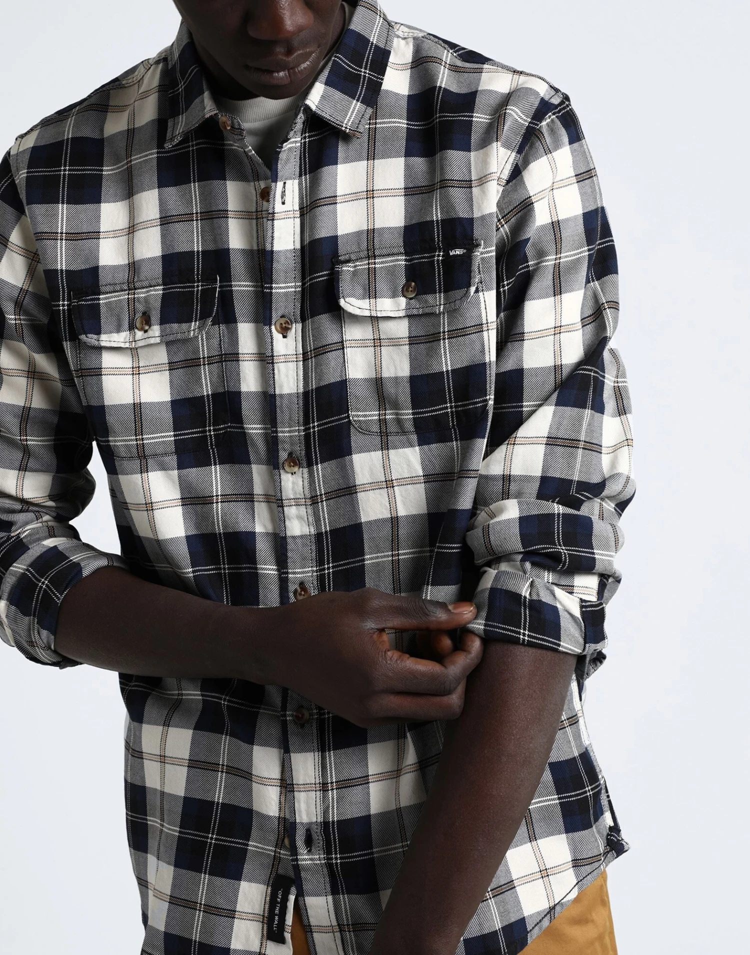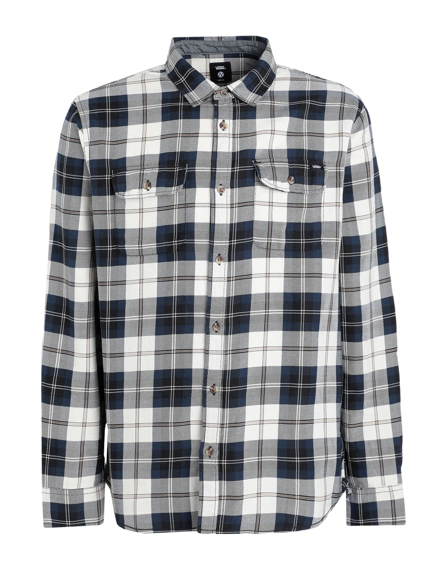 flannel, brand logo, tartan pattern, classic neckline, long sleeves, buttoned cuffs, button closing, two breast pockets, large sized
